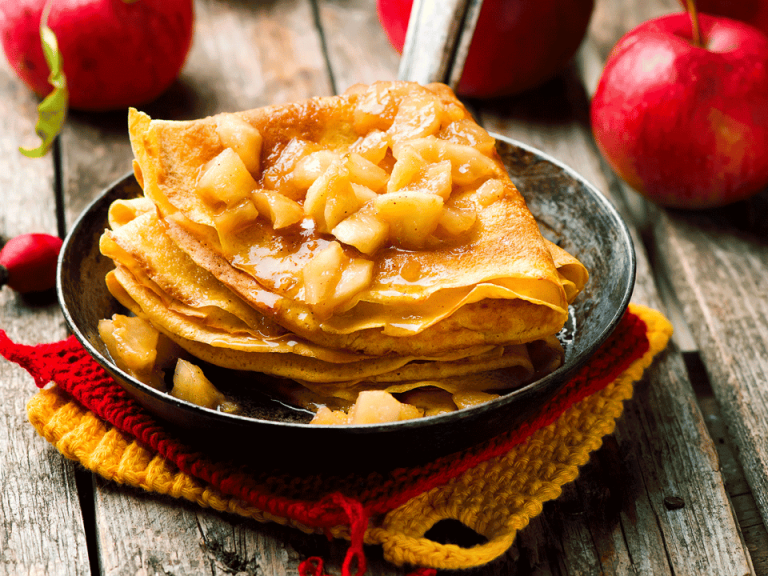 Na náplň rozkrojíme oloupaná jablka na malé kostičky, přidáme cukr a skořici a ve vodě uvaříme do měkka. Scedíme a poté rozmícháme s troškou skořice a cukrem dle vlastní chuti. Poté, co palačinky naplníme, ihned servírujeme.