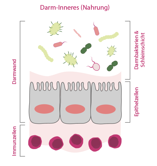 Die Darmschleimhaut besteht aus besonders dicht aneinander stehenden Zellen und ist, wie der Name schon sagt, von einer Schleimschicht umgeben, welche das Eindringen von unerwünschten Stoffen und Keimen verhindern soll. Mit ihrer enormen Oberfläche von 300 – 400 m2 enthält die Darmschleimhaut übrigens 80 % der körpereigenen Immunzellen – das sind dreimal mehr Immunzellen, als Knochenmark, Lymphknoten und Milz zusammen enthalten – und ist somit der größte und wichtigste Teil unserer Abwehrkraft.