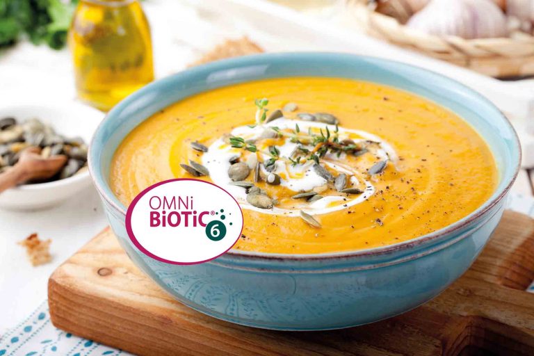 Kürbis und Papaya schälen und in Würfel schneiden. Zwiebeln schälen, grob hacken und in Olivenöl glasig dünsten. Kürbis- und Papayastücke beifügen, Suppenwürze und Galgant dazugeben, kurz mitrösten und mit Wasser aufgießen. 20 Minuten kochen, anschließend pürieren und mit Worcestershiresauce, Tamari und Salz abschmecken. Die Suppe auf Genusstemperatur überkühlen lassen und in Schalen servieren. Schlagobers mit OMNi-BiOTiC® 6 vermengen (10 Minuten Aktivierungszeit abwarten) und als Muster in die Suppe einrühren.