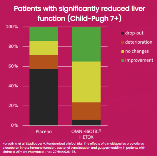 The more severe the cirrhosis of the liver, the lower the chances of survival. With 7 or more points in the Child-Pugh Score, the 5-year chance of survival is only 26%, with more than 10 points only 15%. In a randomised clinical trial, the 6-month intake of OMNi-BiOTiC® HETOX led to an impressive improvement in the Child-Pugh scores in 38% of the patients who had significantly reduced liver function (Child-Pugh 7+) at the start of the study. The difference between the group who received the probiotic, and the placebo group clearly shows what impact taking a multispecies probiotic can have on severe liver damage.